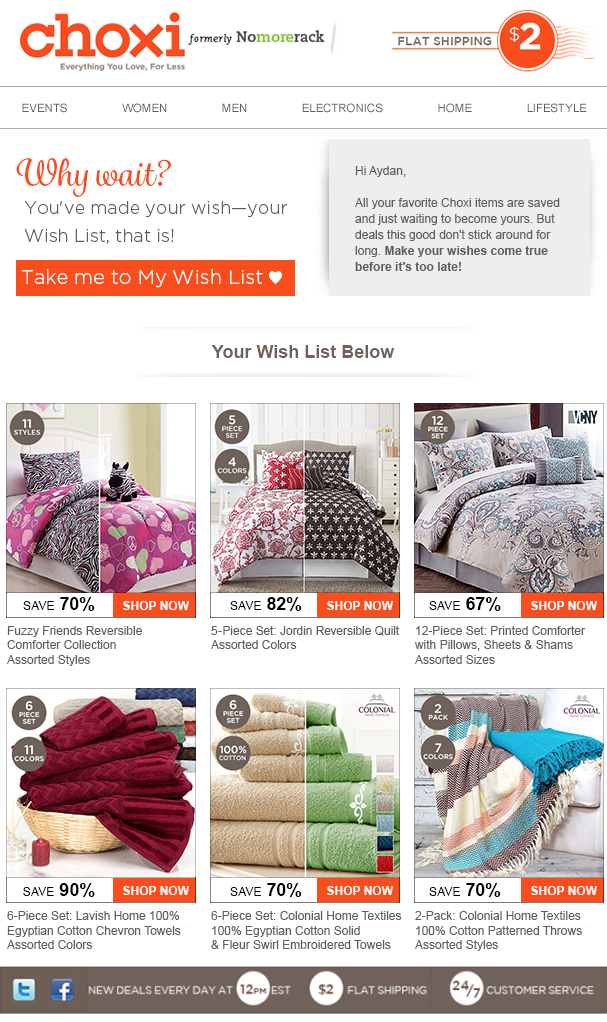 Choxi (formerly NoMoreRack) was an online shopping destination for those who wanted quality, brand-name apparel and accessories at up to 80% off retail. We offered authentic designer merchandise, non-branded, trendy items, and fabulous fashions at unbelievable prices.